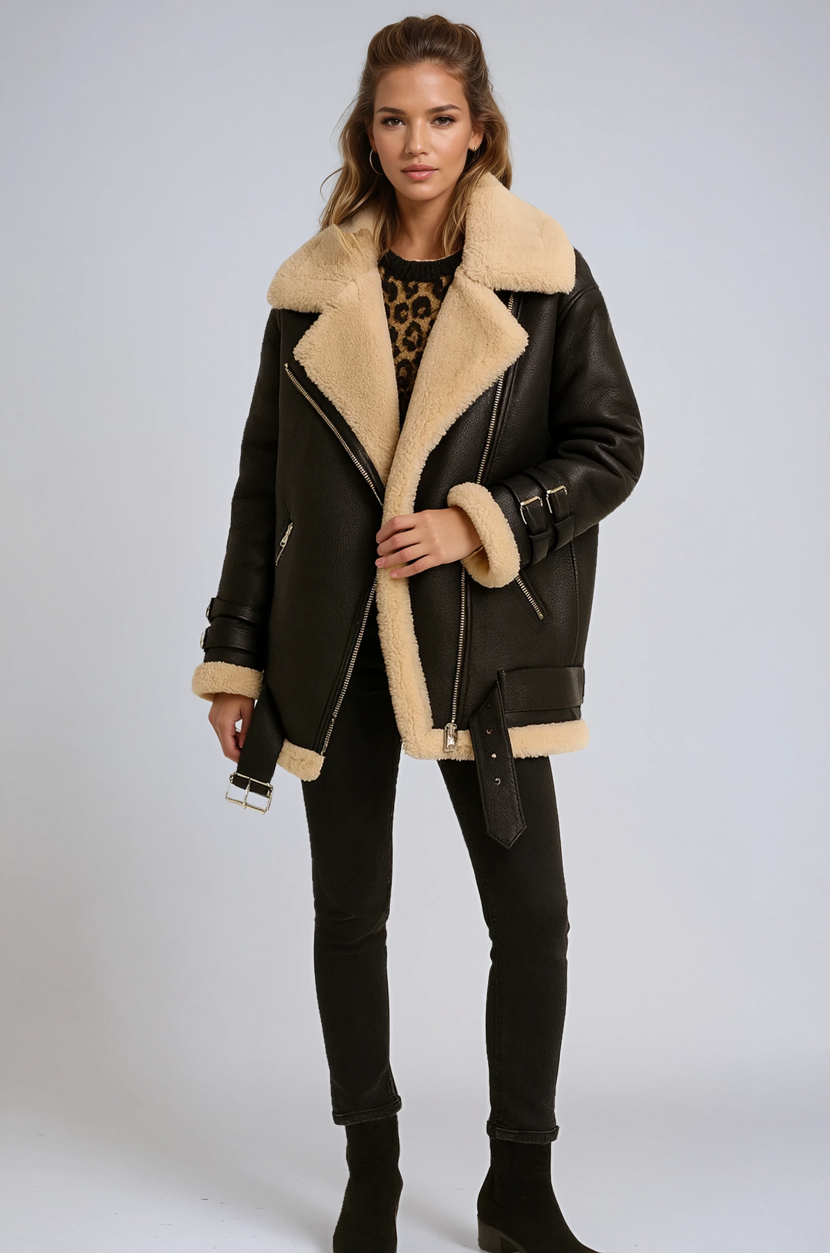 The Margaux | Classic Winter Pilot Jacket embodies the spirit of a woman who revels in sophistication and comfort. This exquisite bomber jacket, with its sumptuous sheepskin lining, transforms a classic silhouette into a statement of modern luxury. The soft suede finish caresses the skin, while the distinctive straps and buckles speak to her unique sense of style. Whether worn over tailored trousers or a flowing dress, the Margaux is designed for the discerning woman who commands attention with grace.